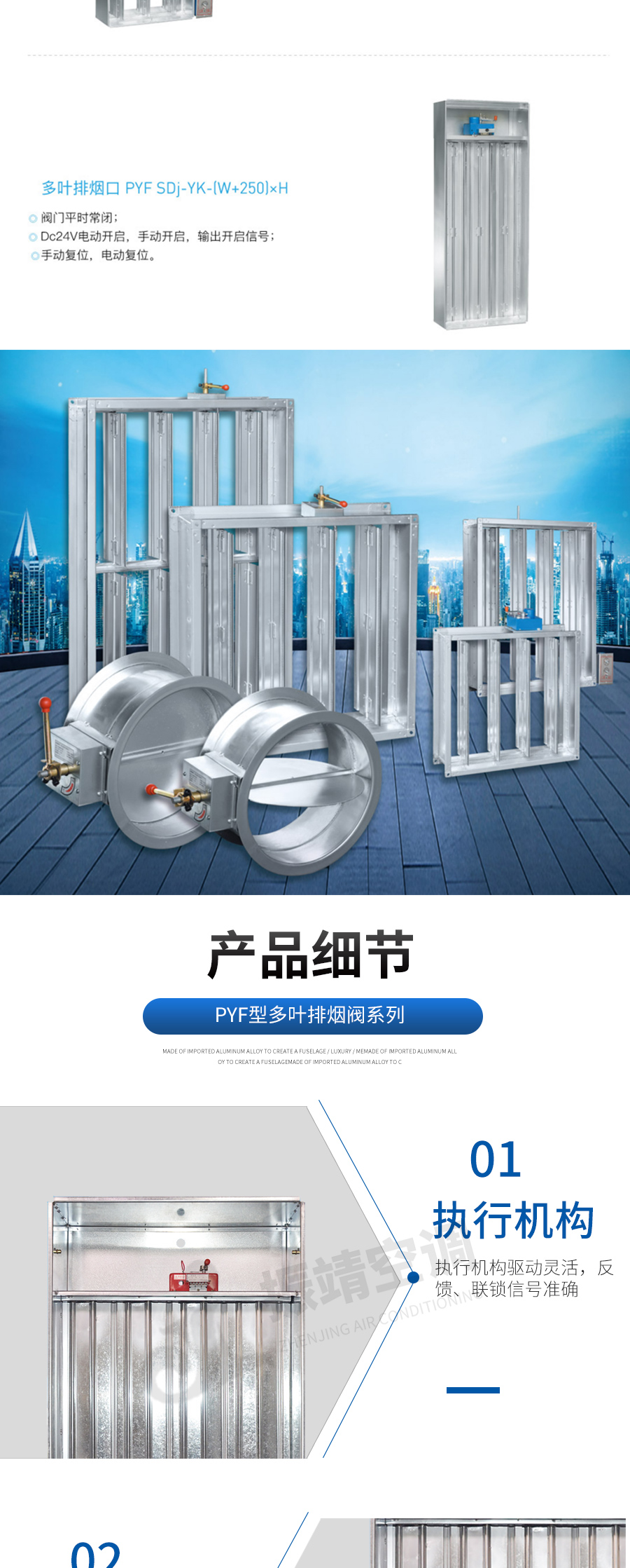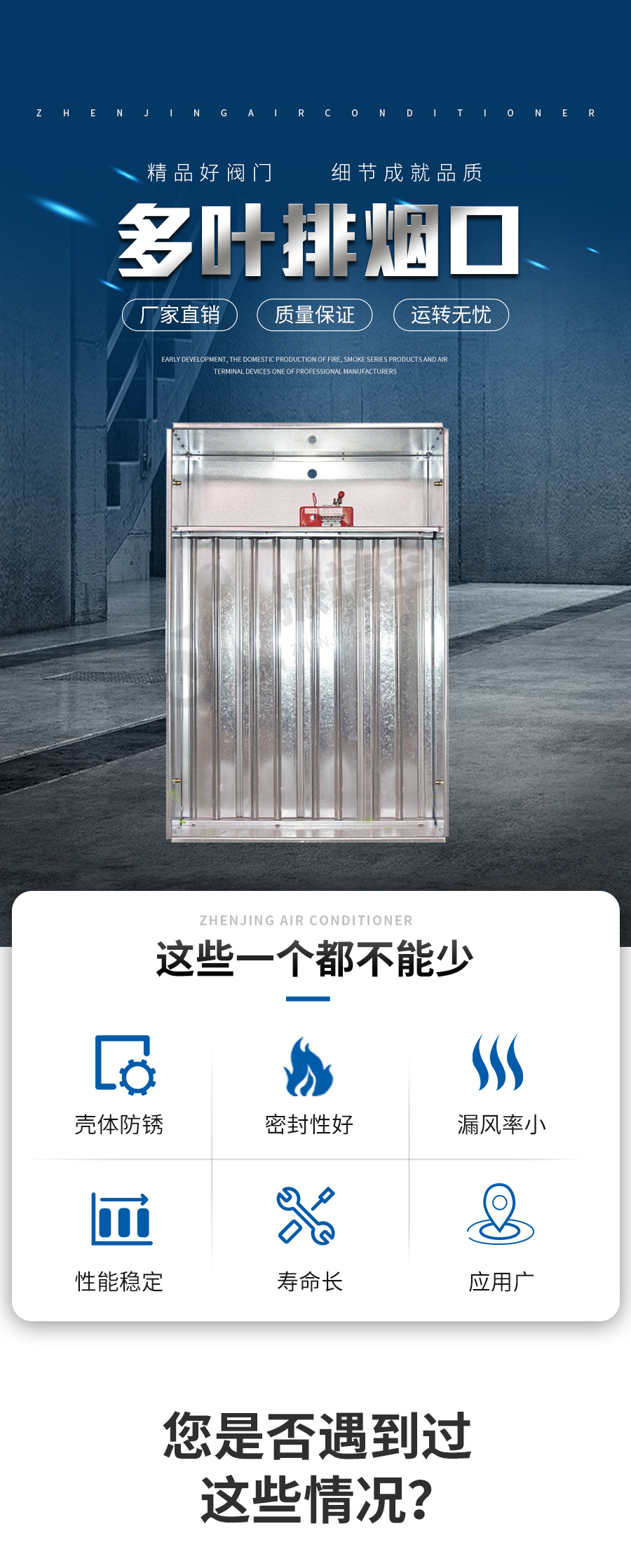 多葉排煙口一般安裝在過道或防煙前室,平時常閉,發生火災時煙感探頭發出火警信號,控制中心給閥上電磁鐵接通電信號使閥門迅速打開,也可人手動迅速打開閥門進行排煙。
