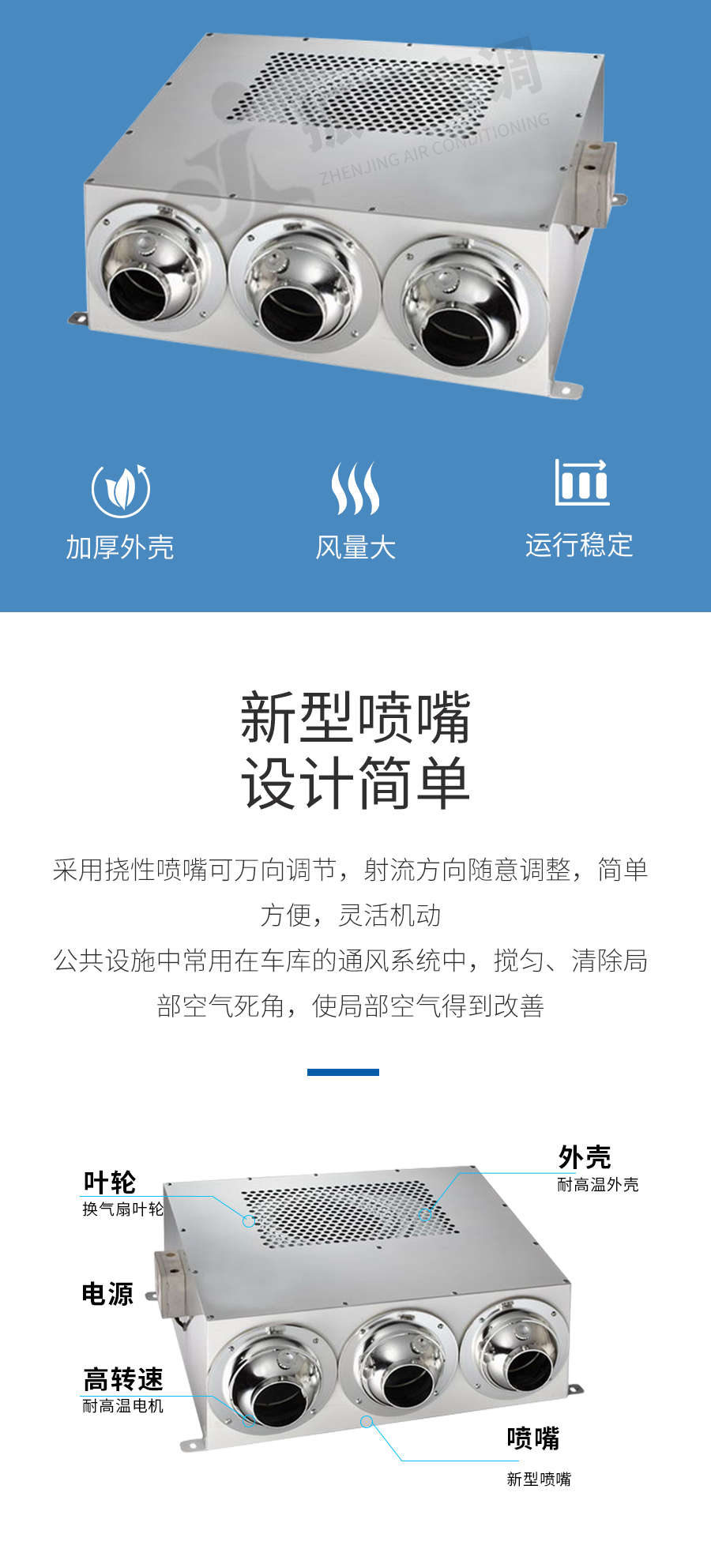 誘導風機特點:噪聲低、體積小、重量輕、臥式安裝、調節靈活、回轉角大、可適應多和環境安裝,外形美觀大方 。應用:地下停車場、體育館、車間、倉庫、商場、超市、娛樂場所等大面積場合的誘導通風。