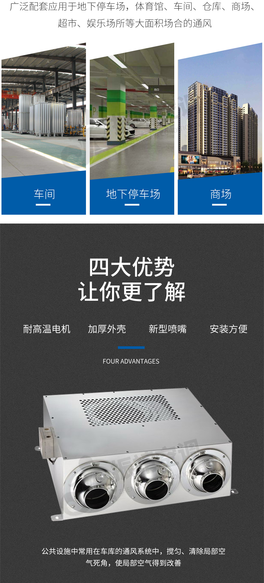 應用:地下停車場、體育館、車間、倉庫、商場、超市、娛樂場所等大面積場合的誘導通風。