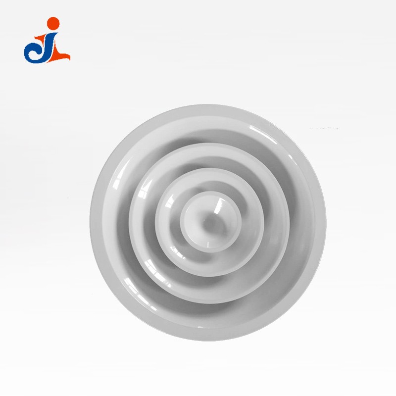 圓形散流器一般用于冷暖送風。通常安裝在頂棚上。其吹出氣流呈貼附(平送)型,其結構為多層錐面形。由于室內誘導氣流大于排風量,因此吹出氣流減速較快。因此相對任意大小面積來說可以供給較大風量,而且在給定的風量范圍內擴散半徑的大小變化。